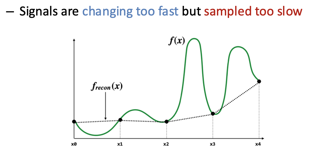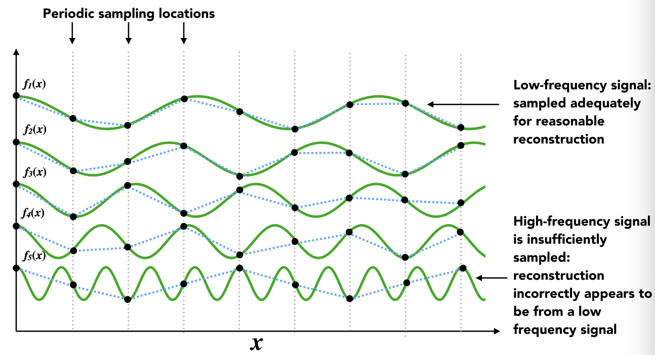 在采样频率足够大时,右图中采样得到的三角形不会重叠,若采样频率过小,则三角形会发生重叠,此时即发生了混叠 (aliasing),信号失真,无法通过采样后的信号还原原来信号的频谱,若要不发生失真,则