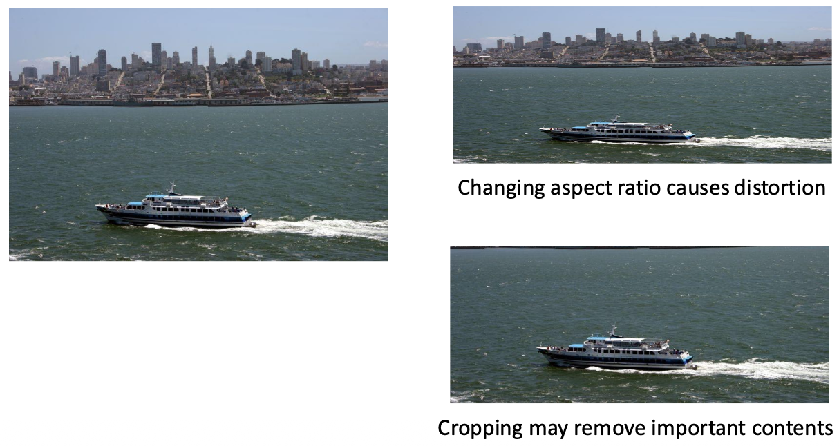 直接压缩会导致画面内容发生畸变,直接剪切可能会导致画面中重要的信息丢失