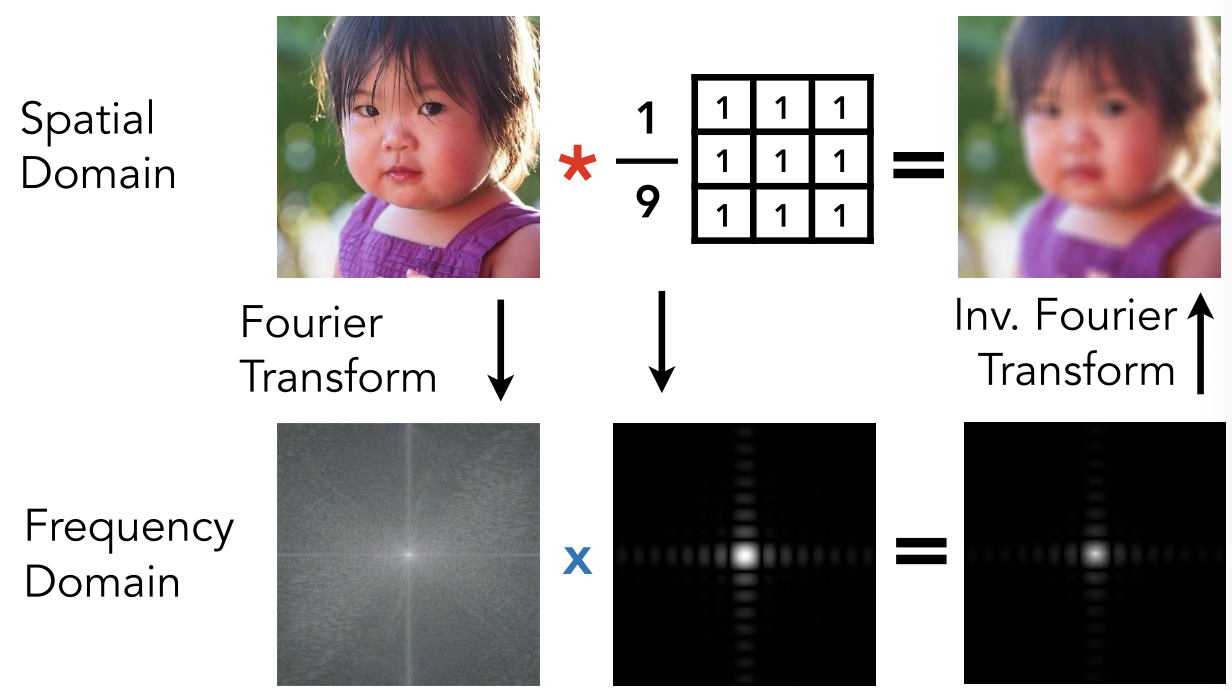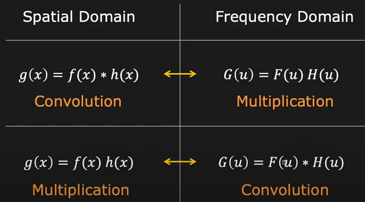 空间域中两个信号的卷积等价于频域中两个信号的乘积;同理,空间域中两个信号的乘积等价于频域中两个信号的卷积