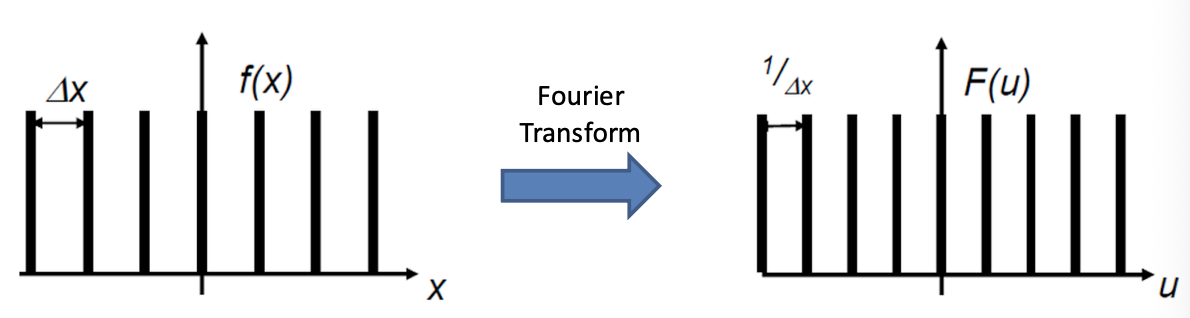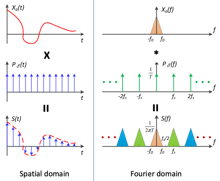 采样信号等价于在空间域中将信号与采样函数 (周期脉冲函数/周期狄拉克函数 Dirac comb function) 相乘