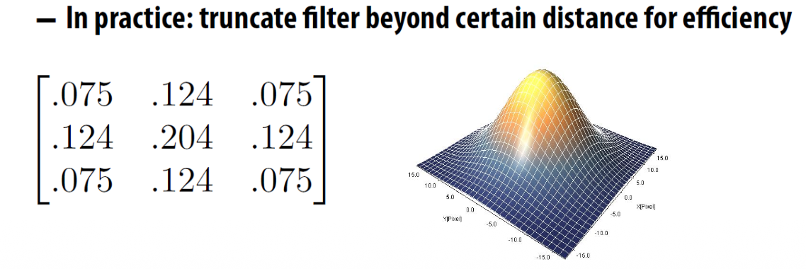 卷积核由高斯公式计算得到,其中,使用的高斯公式越平缓 (尖峰部分越矮),模糊效果越明显