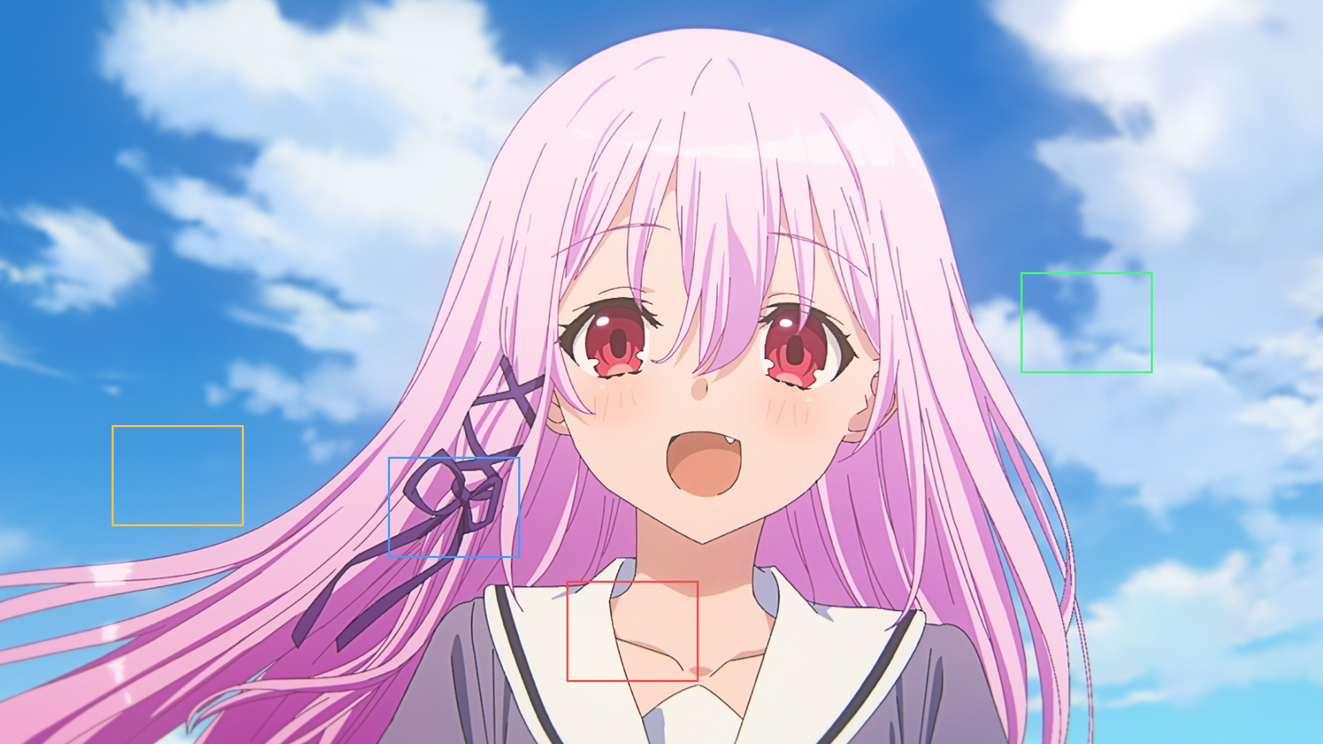 噪点 (noise) 是一类特殊的画面要素,表现为随机的像素涨落,它可以叠加到以上任意要素中。噪点的频率构成取决于其种类,白噪声在各个频率的强度完全一致,而一般动画原盘所带的噪点则涵盖低频到中高频,随频率增高而略有下降,最高频部分则基本被砍掉。